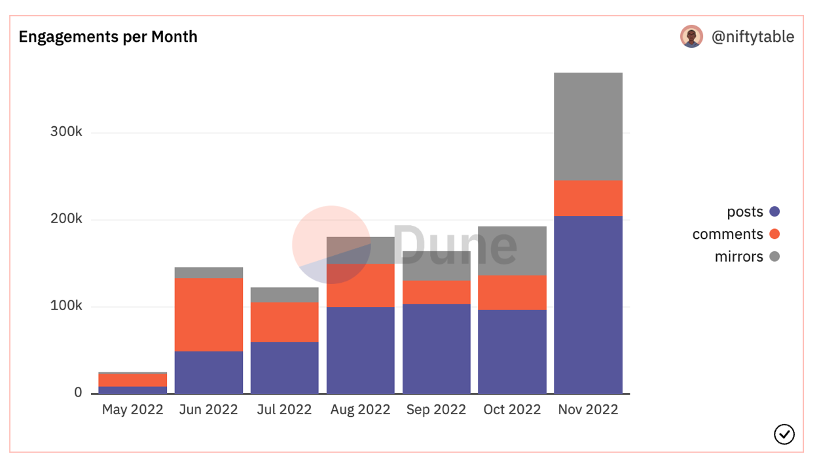 The monthly engagements have also increased with remarkable growth in November. Obviously, this could also entail that users are speculating about an upcoming Lens airdrop. For more information, go here.