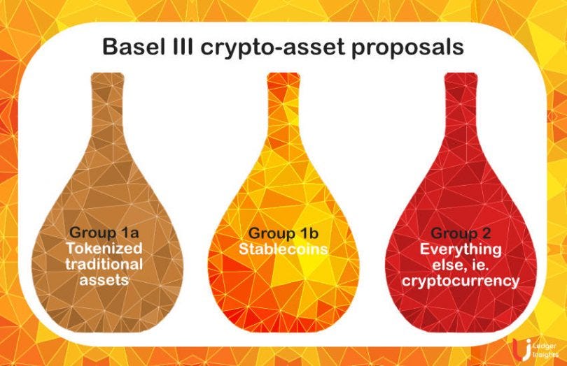 The BCBS, which sets capital requirements in the Basel framework, advised that digital assets be separated into two groups (this guidance was finalized from a June BCBS report):