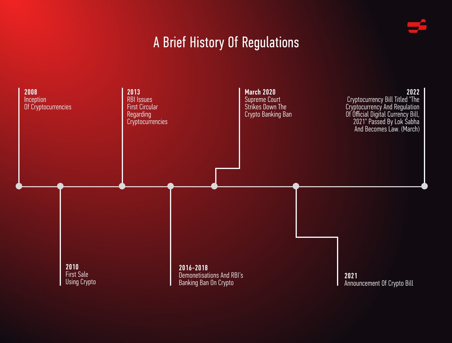 Here is a brief timeline of Indian cryptocurrency regulation, highlighting the key events, decisions, and policies that shaped the industry in India.
