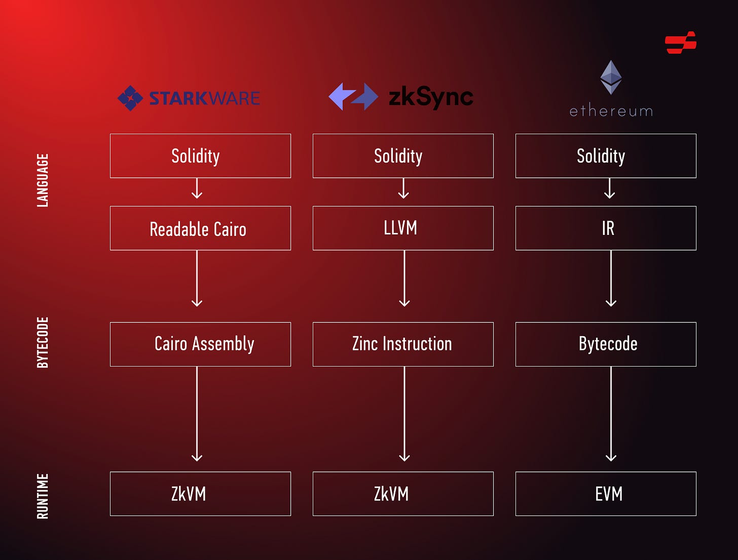 One example of this approach is the implementation of type 4 zkEVMs such as StarkWare’s Cairo zkVM and zkSync’s zinc zkVM. These solutions introduce a new language that is optimized for supporting validity proofs and custom opcodes. They use custom transpilers to convert Solidity into their native higher-level languages such as Cairo or Yul respectively. While this approach may be easier to build and optimize, it does not support existing Ethereum developer tooling and may not support certain functionality. Furthermore, it introduces further complexity as developers and auditors may need to learn Cairo or Yul, resulting in high barriers to entry. Furthermore, it would result in poor maintainability as teams would need to constantly rework or update their zkEVM as the EVM continues to evolve.