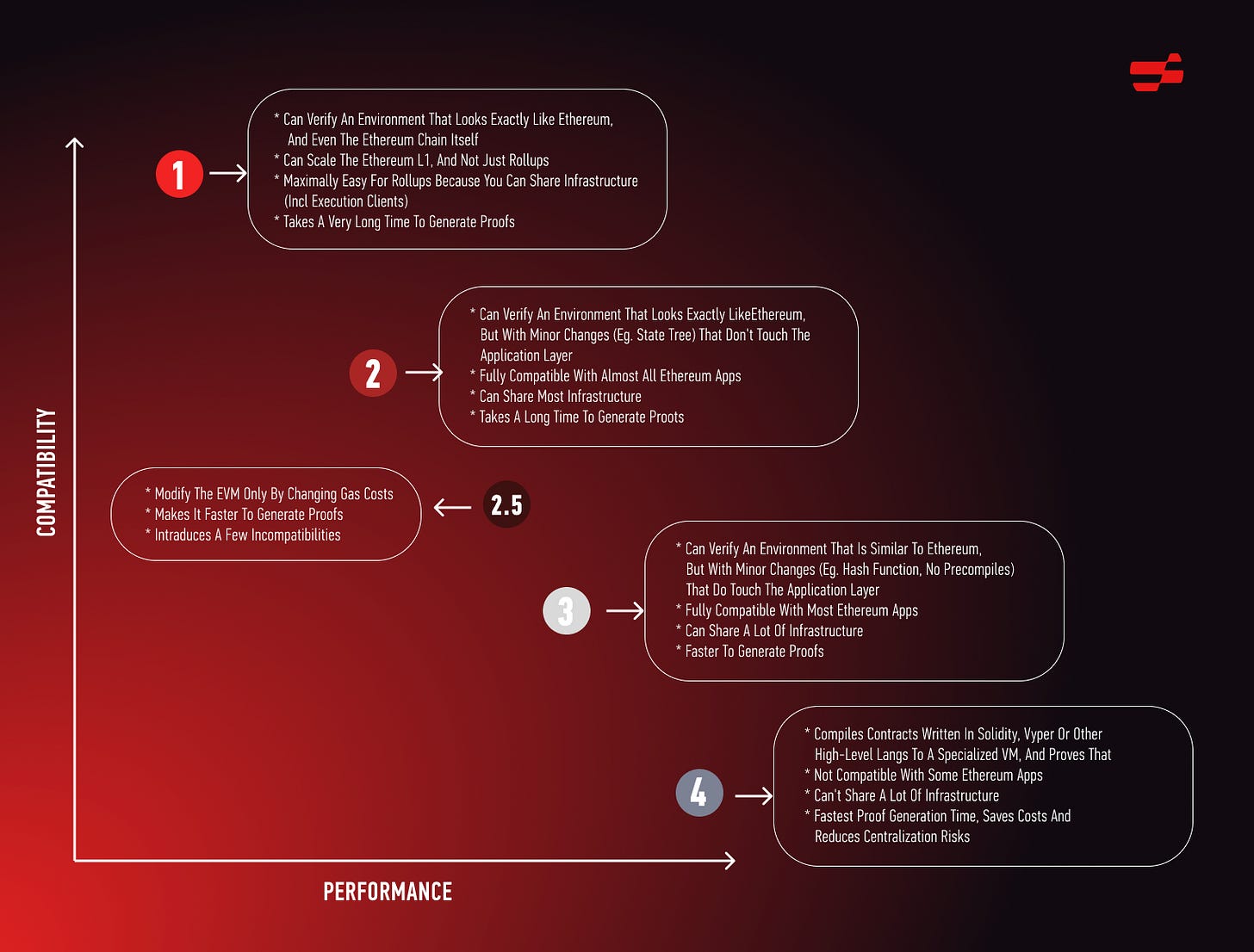 The EVM was not designed to support zero-knowledge proofs. It uses special opcodes (CALL), error types and gas, and relies on special hashing functions (Keccak) and data structures (Merkle Patricia Trie) that have massive storage overheads. In August of 2022, Vitalik Buterin introduced his taxonomy for zkEVM types and the zkEVM ‘dilemma’, where greater compatibility with Ethereum comes at the cost of longer proof times and thereby lower performance.