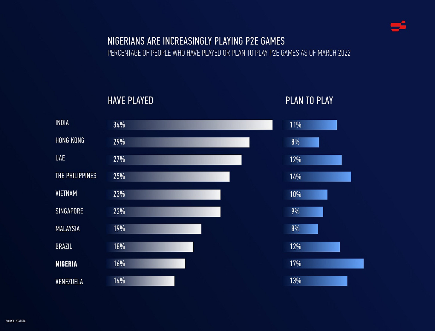 Play-to-earn has been attributed to being a major driver for the growth of the industry. Before this new model emerged, gamers had limited options to make money from playing games. Free-to-play games like Candy Crush and freemium console games such as Call of Duty: Warzone and Fortnite were available, but offered little financial gain. Pay-to-play options were also available, but gamers had to pay for additional content on mobile or console games. Findings from a March 2022 survey showed that 16% of Nigerians say they have played blockchain P2E games and 17% say they plan to play.