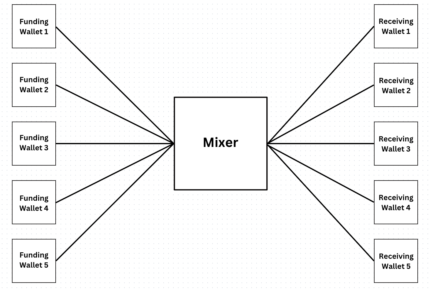 This is because moving that quantity of funds on chain without detection is exceedingly difficult, as even the most commonly used technology–mixers such as Tornado Cash–do not completely obfuscate the trail of funds, especially in larger quantities. Since mixers rely on the batching of several transactions to slash the link between sender and receiver (a visual depiction below, but note that significantly more wallets are typically involved), an increase in the quantity of funds makes undetectability far more difficult. Since both the sending and receiving wallets can be seen as interacting with the mixer’s smart contract, it gives a basis for detection, and leaves the exploiter with two main issues: