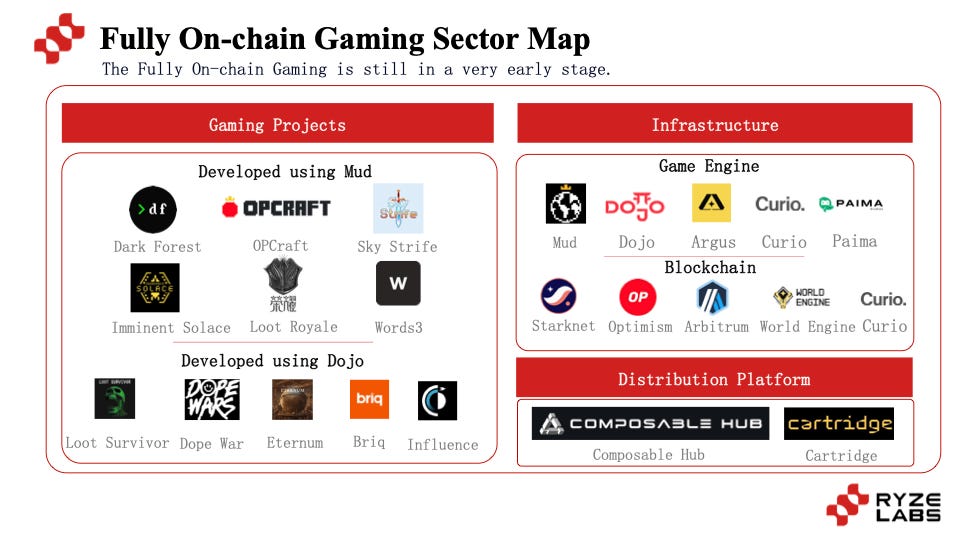 Currently, the entire full on-chain gaming industry is in a very early stage, with both game projects and related infrastructure under development. In the industry landscape of full on-chain gaming, it can be broadly divided into four main categories: full on-chain game projects, full on-chain game engines, full on-chain gaming blockchains, and full on-chain game distribution platforms.