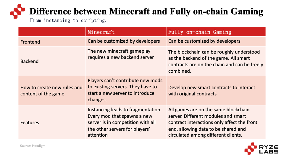 The creation of new gameplay in Minecraft requires setting up new servers, but the difference in full on-chain games is that they share the same backend. Different mods and smart contract interactions only affect the frontend, allowing data to be shared and circulated across different clients.