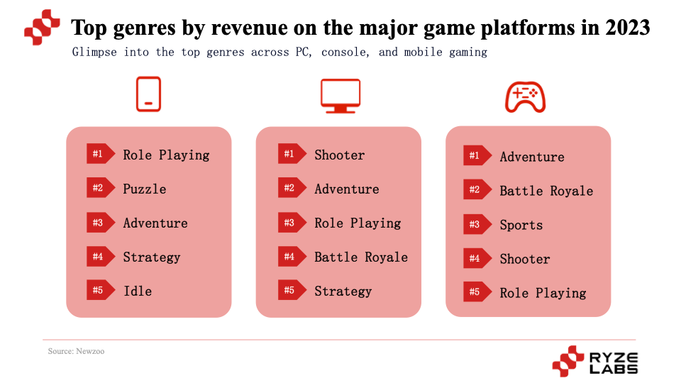 According to data from Newzoo, role-playing and adventure games perform well across PC, mobile, and console platforms, ranking in the top five. Additionally, genres like shooters and battle royales are very popular on PC and consoles. On mobile platforms, puzzle and idle games also enjoy considerable popularity among users.