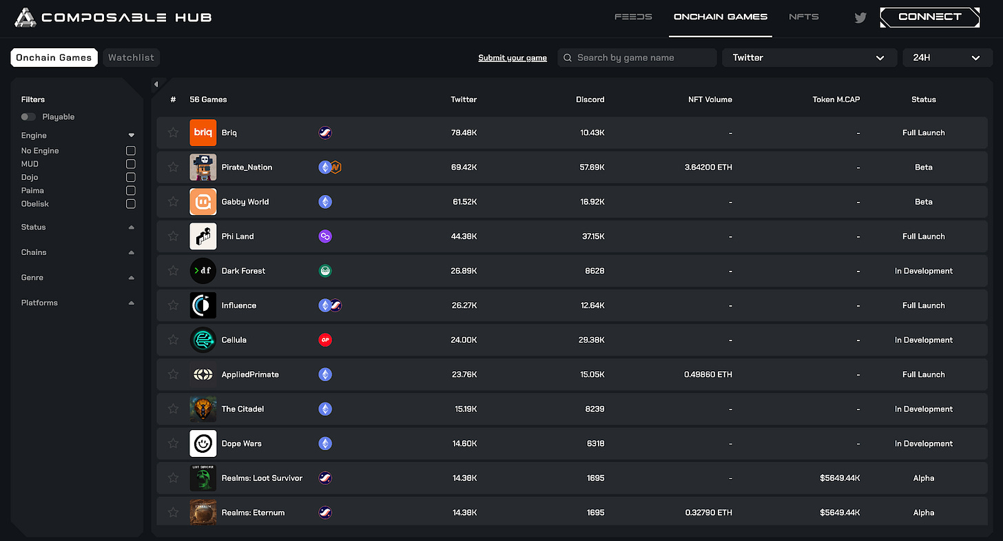 Currently, there are two main platforms dedicated to aggregating full on-chain games: Composable Hub and Cartridge.
