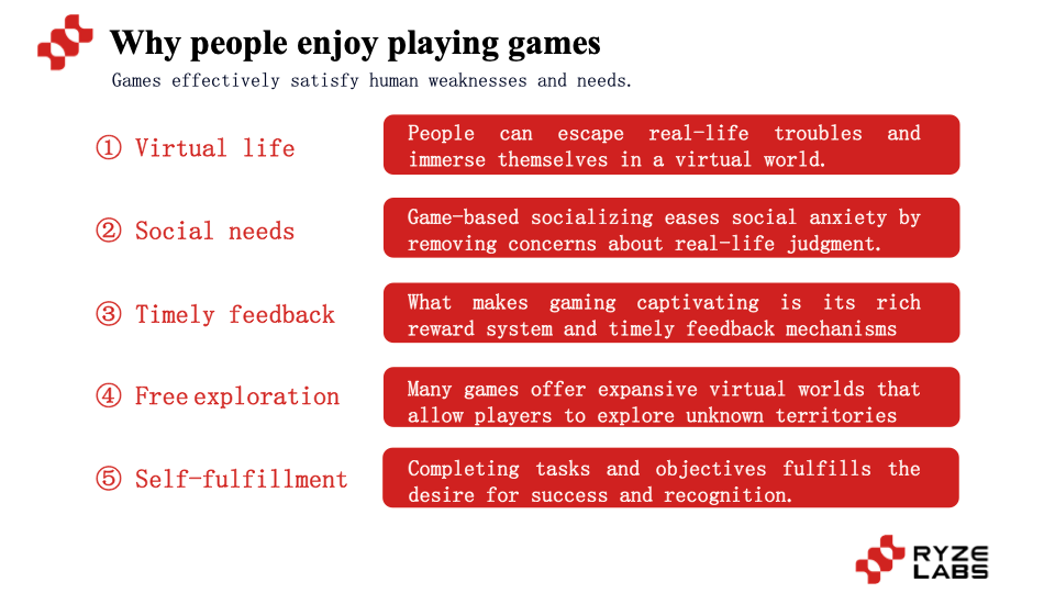 Pursuit of Achievement and Self-Actualization: By completing a series of tasks and goals, people can fulfill their desire for success and recognition. Whether it's leaderboards or achievement points, in games, people can more easily achieve self-challenges and character growth.