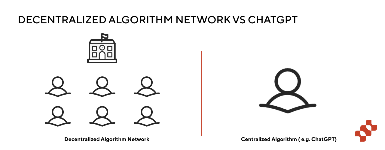 In simple terms, ChatGPT is like a highly capable student solving different types of problems, while the decentralized algorithm network is like a school with many students solving problems together. Although the current student (ChatGPT) is highly capable, there is significant potential for recruiting students globally in the long run.