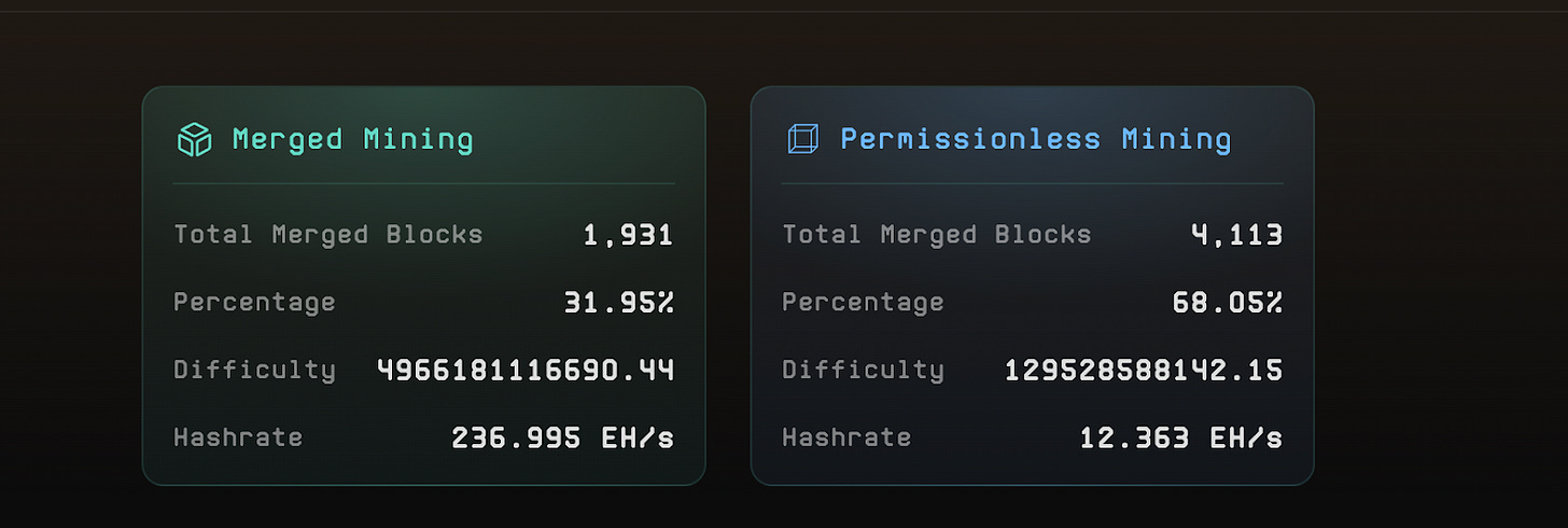 Strong Mining and Network Security: 30-40% of Bitcoin Hashrates via Merge Mining and 1-2% of Bitcoin Hashrates via Solo Permissionless Mining.