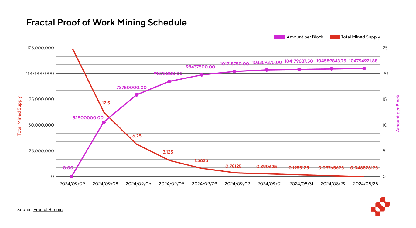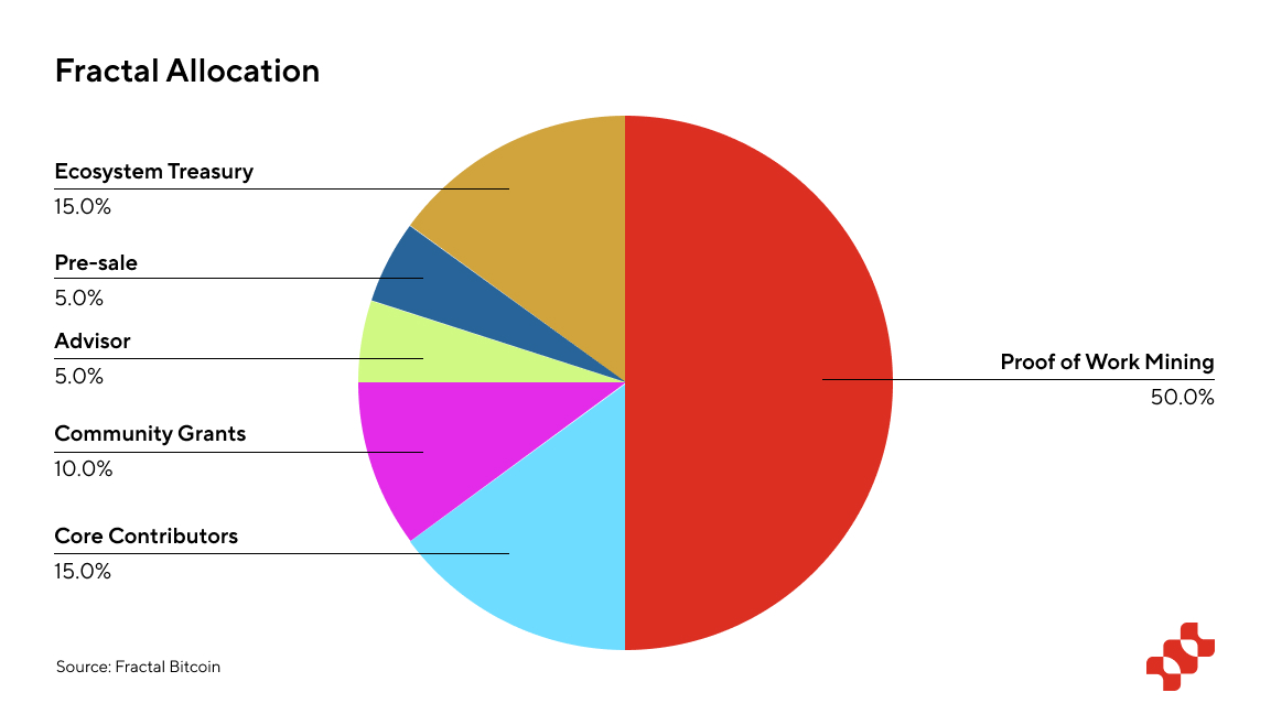 Proof of Work Mining (50%): Half of the total token supply is allocated to Proof of Work (PoW) mining. This significant allocation aligns Fractal closely with Bitcoin's security model, ensuring network security and reliable block production.