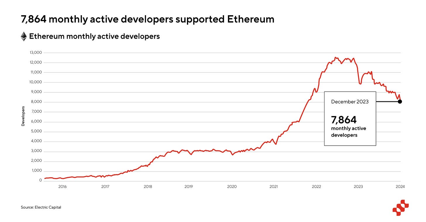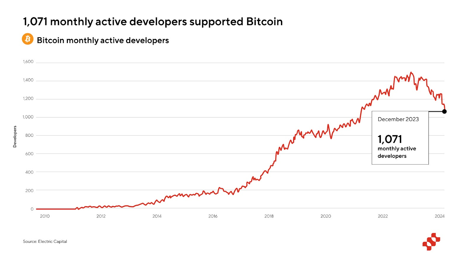 Programmability emerges as a primary challenge for Fractal. Due to its 100% compatibility with Bitcoin mainnet, Fractal is programmed using Bitcoin Script, which could present hurdles for ecosystem growth. To put things in perspective, there are 1071 Monthly Active Developers in Bitcoin according to the Electric Capital developer report compared to 7864 Monthly Active Developers in Ethereum.